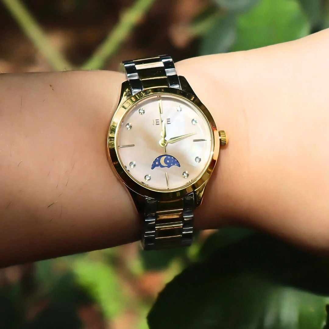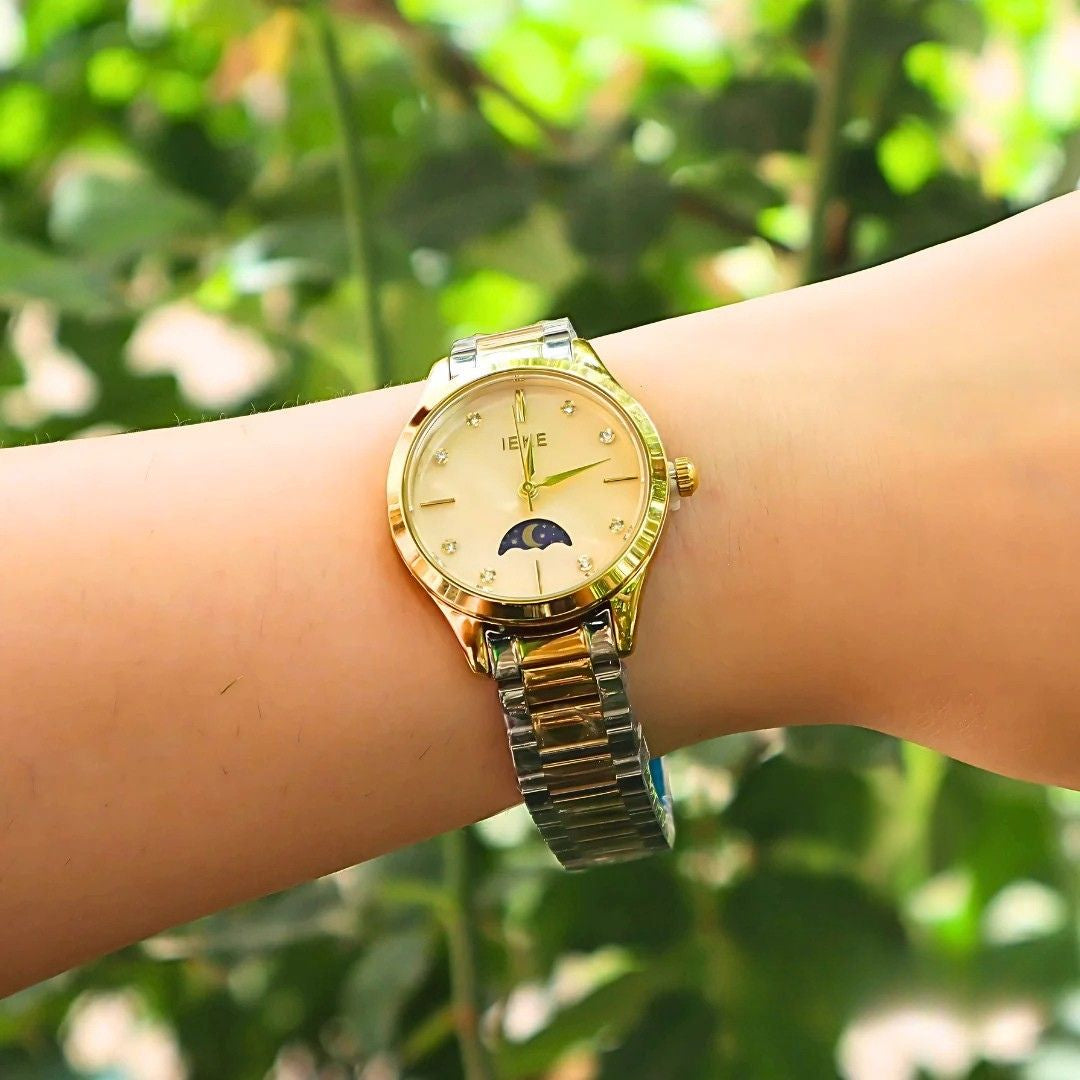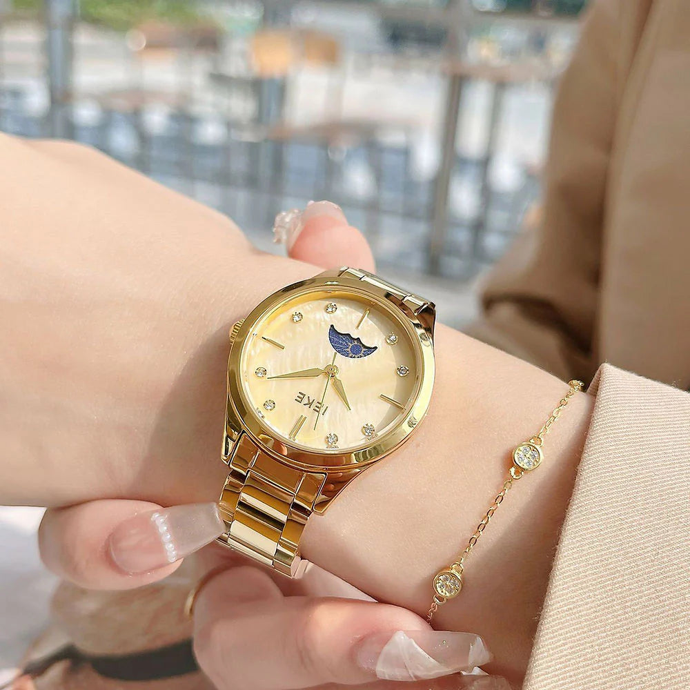 La IEKE Belina se dévoile ici dans une version encore plus précieuse. Son boîtier rectangulaire en acier doré abrite un cadran doré lumineux, orné de perles en guise d’index pour une touche féminine et délicate. Un discret motif de lune bleue s’invite au centre du cadran, comme un clin d’œil céleste à votre élégance. 🌘🤍