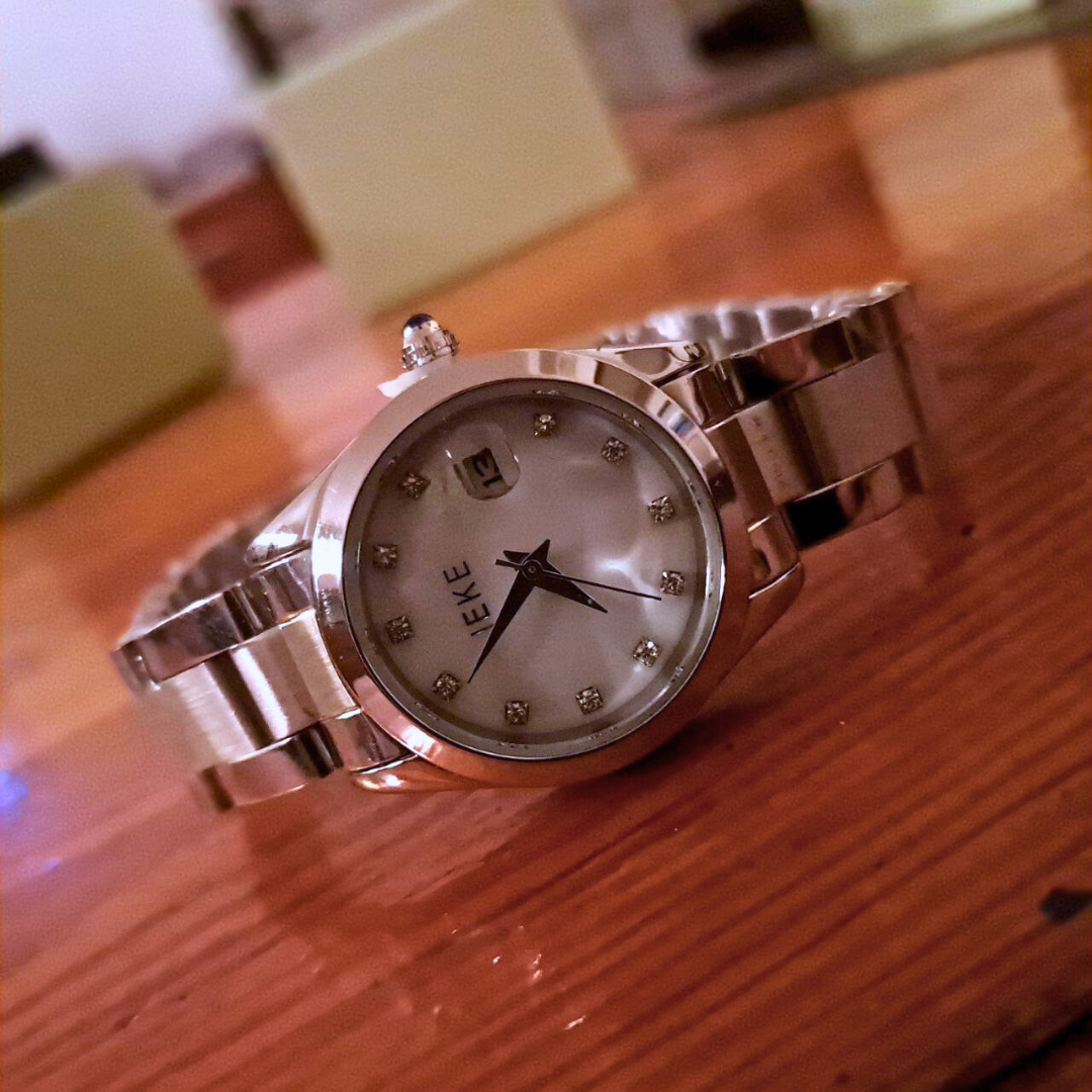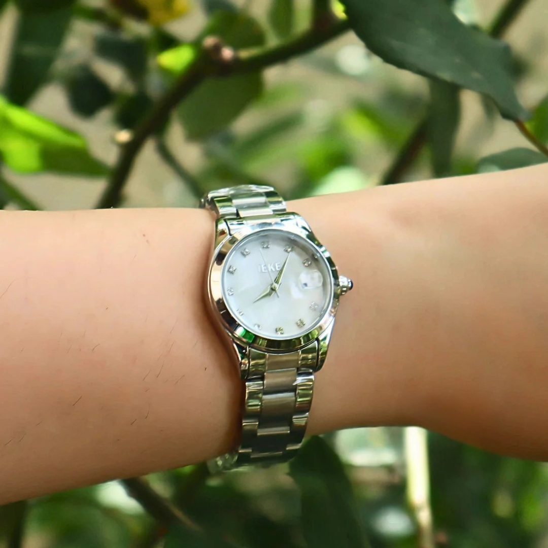 La IEKE Evalina version argentée séduit par sa pureté et son raffinement. Son boîtier rectangulaire de 24 mm, en acier inoxydable finition argent brillant, s’harmonise parfaitement avec un bracelet à maillons fins pour un rendu à la fois discret et précieux. 🤍
