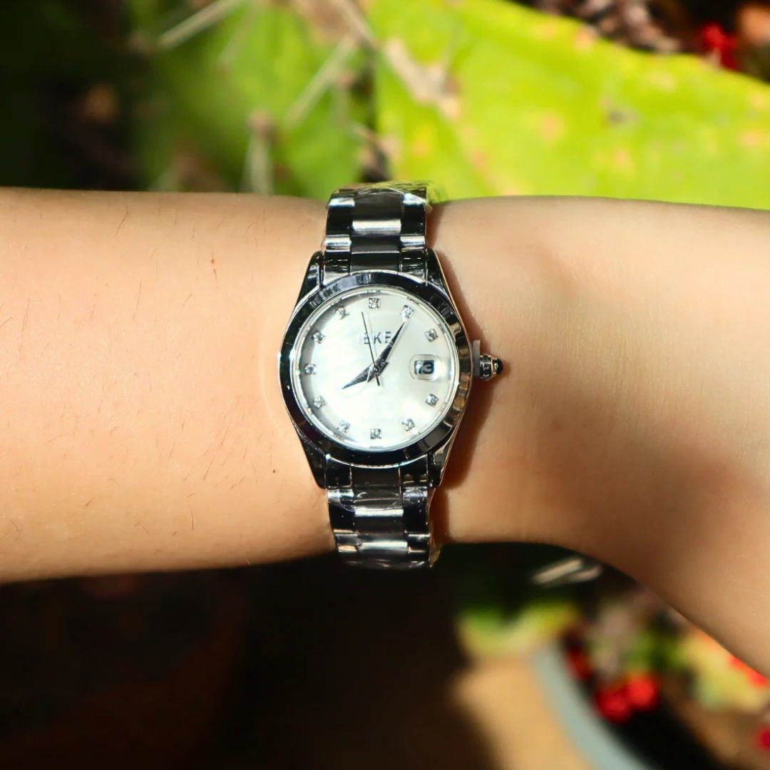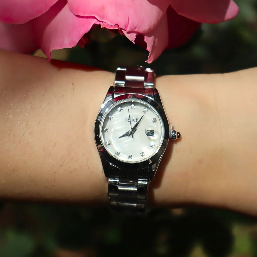 Boîtier argenté, cadran blanc nacré et index en perles : un bijou d’élégance à porter chaque jour. 💎