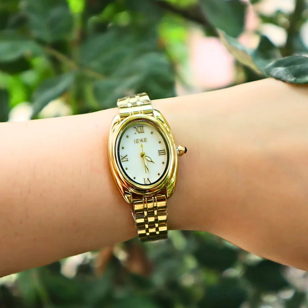 La IEKE Xerxes en version full gold s’impose comme un classique moderne pour les femmes au goût sûr. Son boîtier rectangulaire doré s’accorde parfaitement avec un bracelet en acier doré à maillons fins, pour un rendu lumineux, élégant et toujours chic. ✨