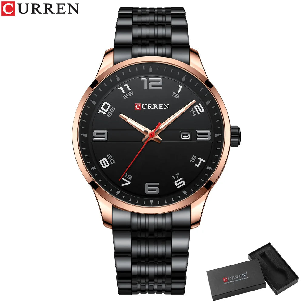 🔹 Bracelet acier noir + boîtier or + cadran noir pour un style chic et contrasté.