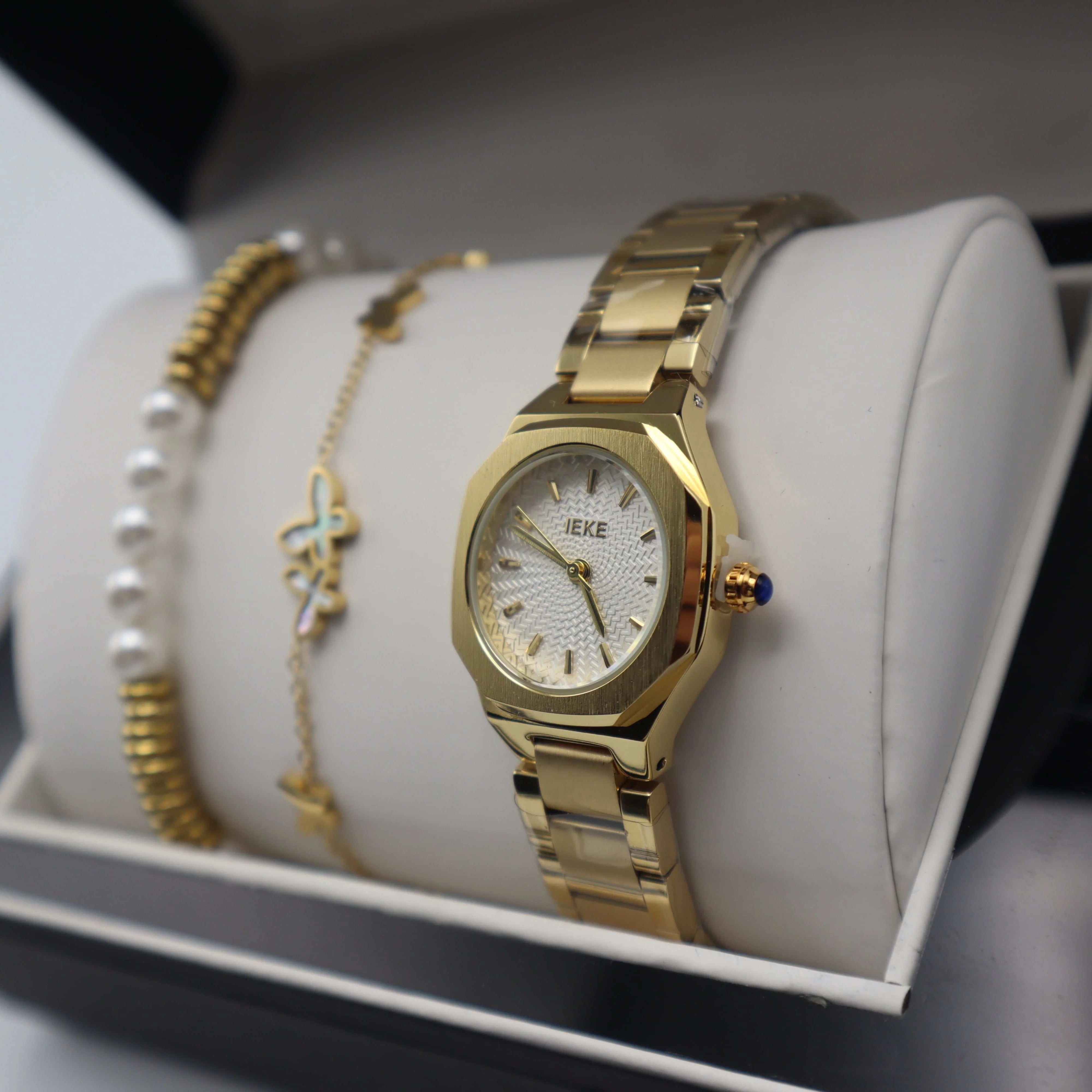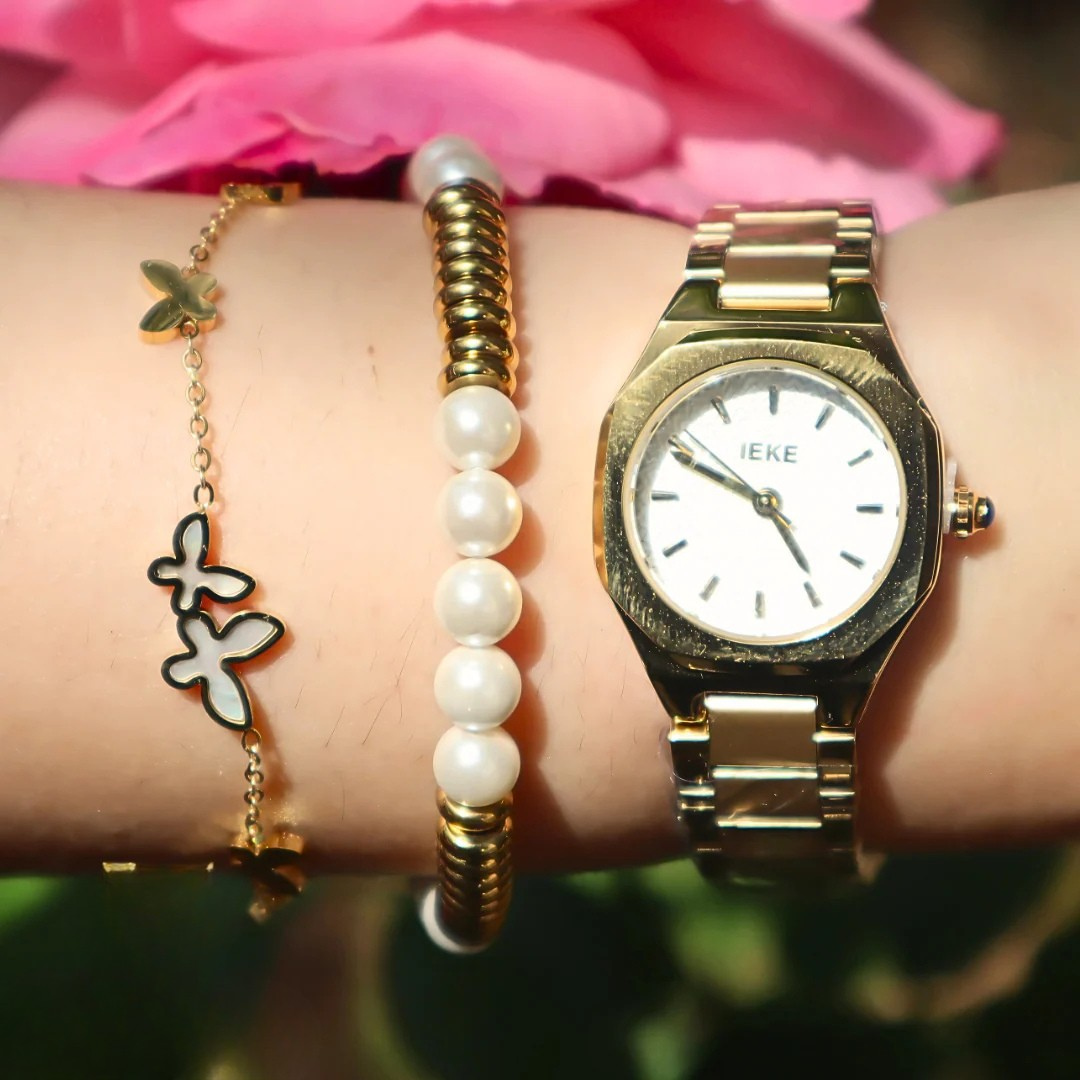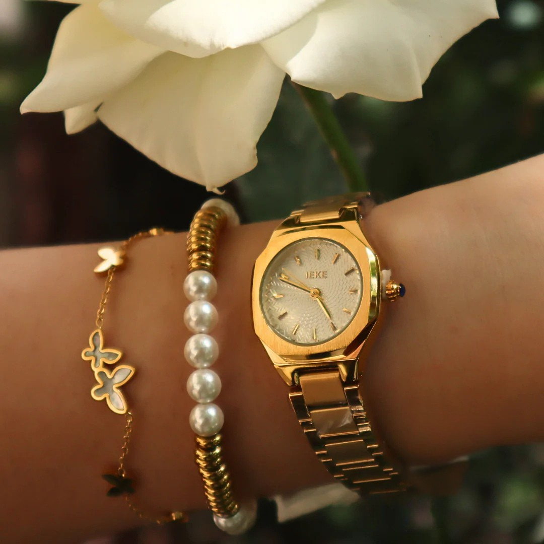 Le coffret IEKE Dova est un hommage à la féminité dans ce qu’elle a de plus éclatant. Sa montre, entièrement dorée du bracelet en acier inoxydable jusqu’au cadran octogonal, incarne l’équilibre parfait entre structure vintage et allure contemporaine. Le boîtier, délicatement travaillé, capte la lumière avec élégance, tandis que les lignes épurées du cadran soulignent un style chic et intemporel.